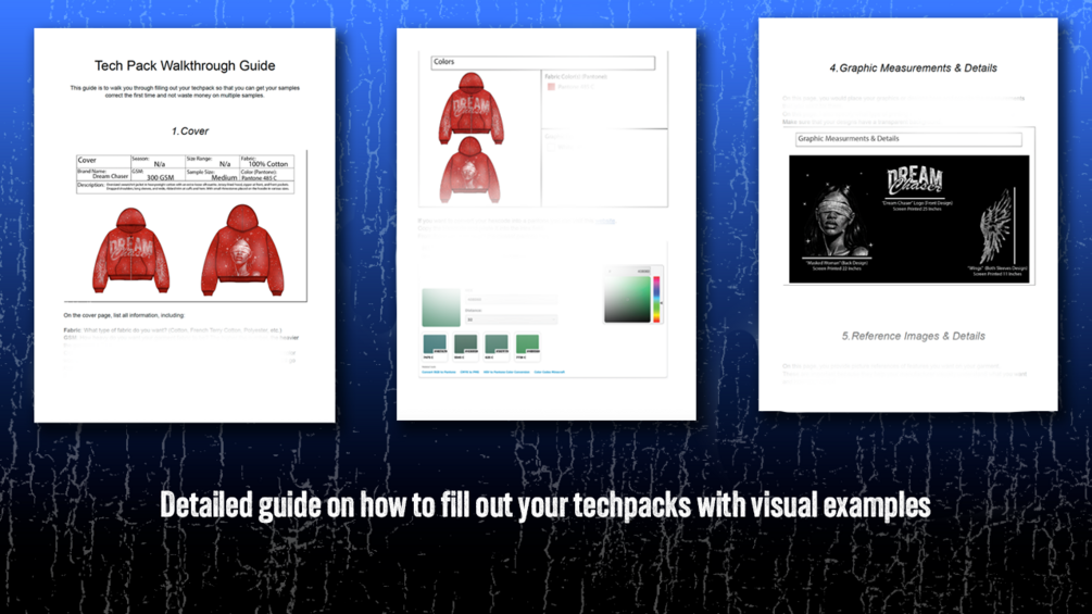 This ready-to-use Tech Pack Template + Step-By-Step Guide helps clothing brand owners clearly communicate measurements, fabrics, colors, graphics, and construction details to manufacturers, so you avoid costly sampling mistakes.